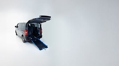 - Acceso trasero, piso rebajado y rampa de mínima inclinación para que acceder con la silla de ruedas sea más sencillo. Gracias al actuador neumático instalado, desplegar y plegar la rampa es una tarea fácil y cómoda. Sin esfuerzos y con una integración en los Proace y Proace City excelente. La rampa hace las veces de suelo para la tercera fila de asientos y el maletero cuando no viaja a bordo una persona con movilidad reducida.